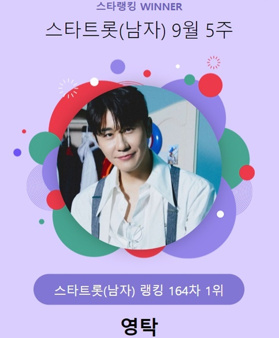 영탁님 스타트롯 9월 5주 남자랭킹 투표 1위 너무 축하드려요!! /사진=스타랭킹 가수 영탁이 스타랭킹 스타트롯 남자 랭킹 부문에서 1위를 차지했다. 영탁은 지난달 26일 오후 3시 1분부터 10월 3일 오후 3시까지 진행된 9월 5주(164차) 스타랭킹 스타트롯 남자 랭킹 투표에서 1위에 올랐다.
