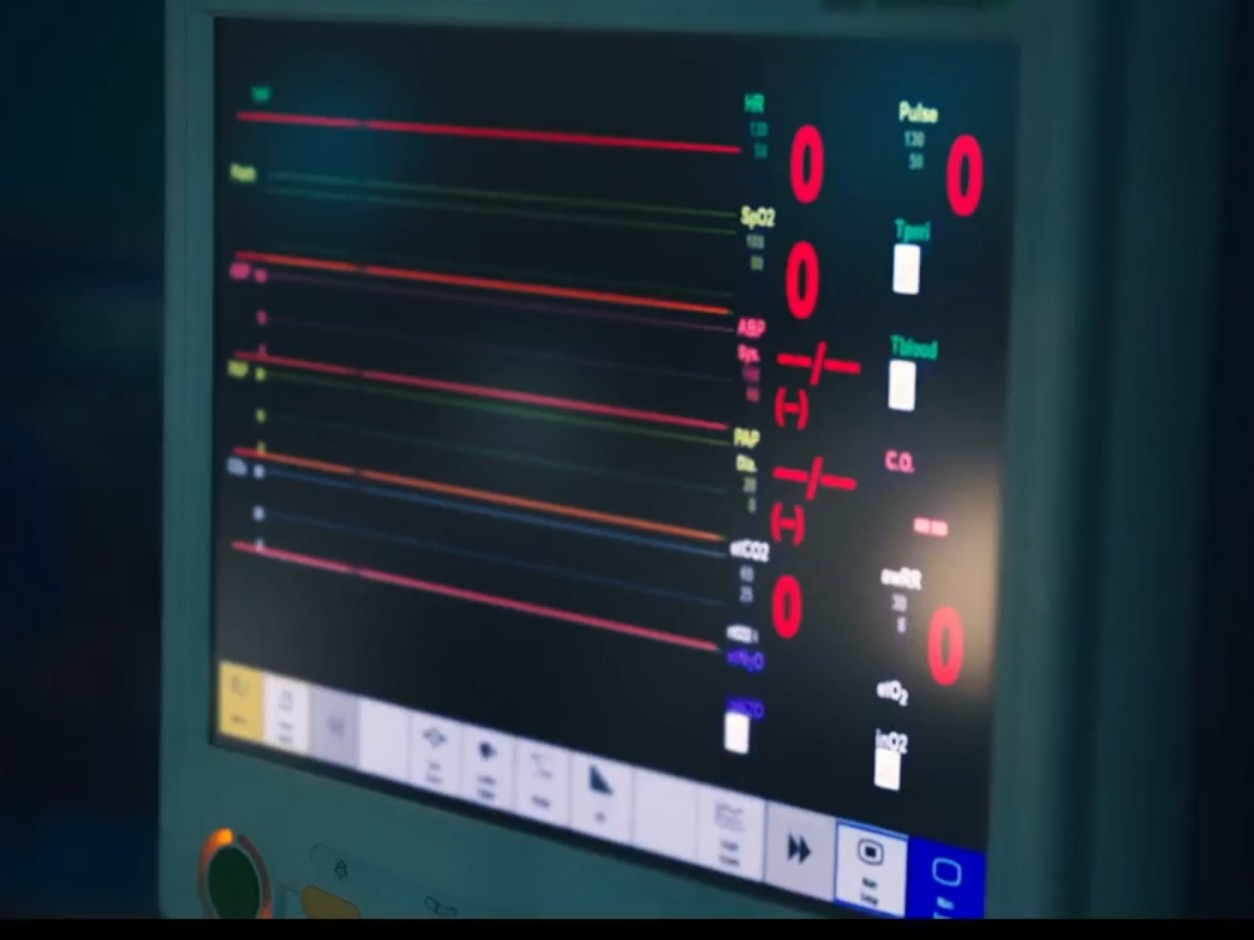 (The patient monitoring device beeps and a code blue is sounded throughout the hospital)
