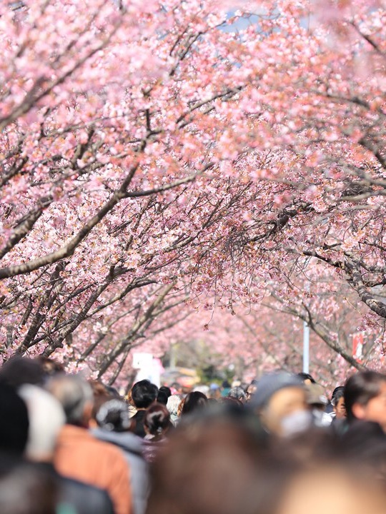 A large number of people passed under the cherry blossom tree.