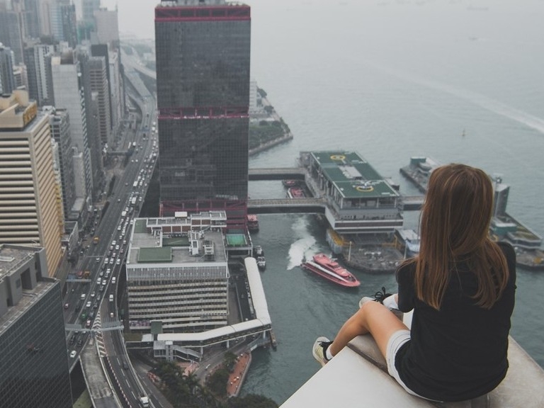 예린이 옥상 가장자리에 앉았다.