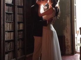 Lucy lifts her foot and tries to kiss Elliot, but Elliot wraps his hand around Lucy's waist and kisses her more deeply.