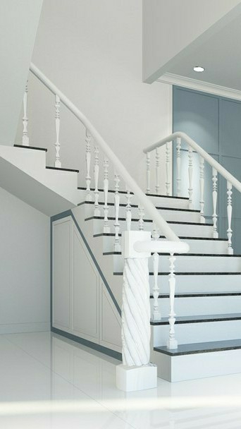 The heroine looks into the living room from the stairs.