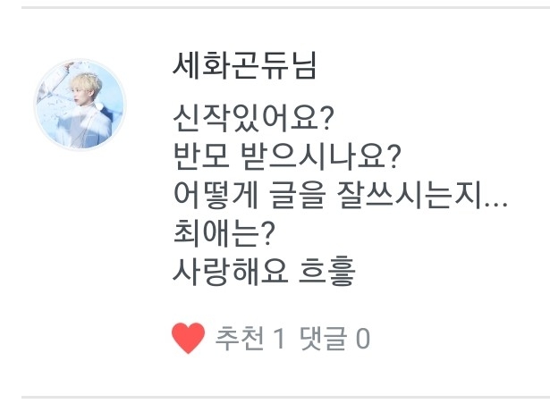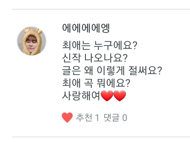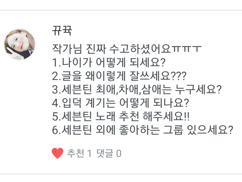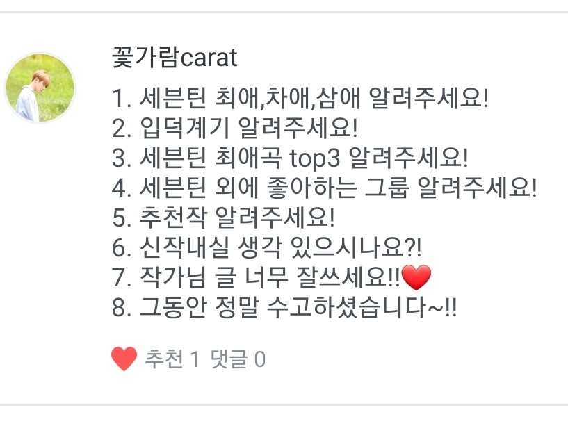 A. I started to get to know them through my friends when I was in the first year of middle school, and then I got into them after watching Akeumda Jihoon on YouTube. Now, I've been a Sebong fan for 668 days (♡´౪``♡)
