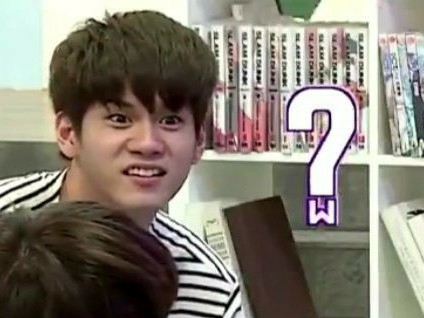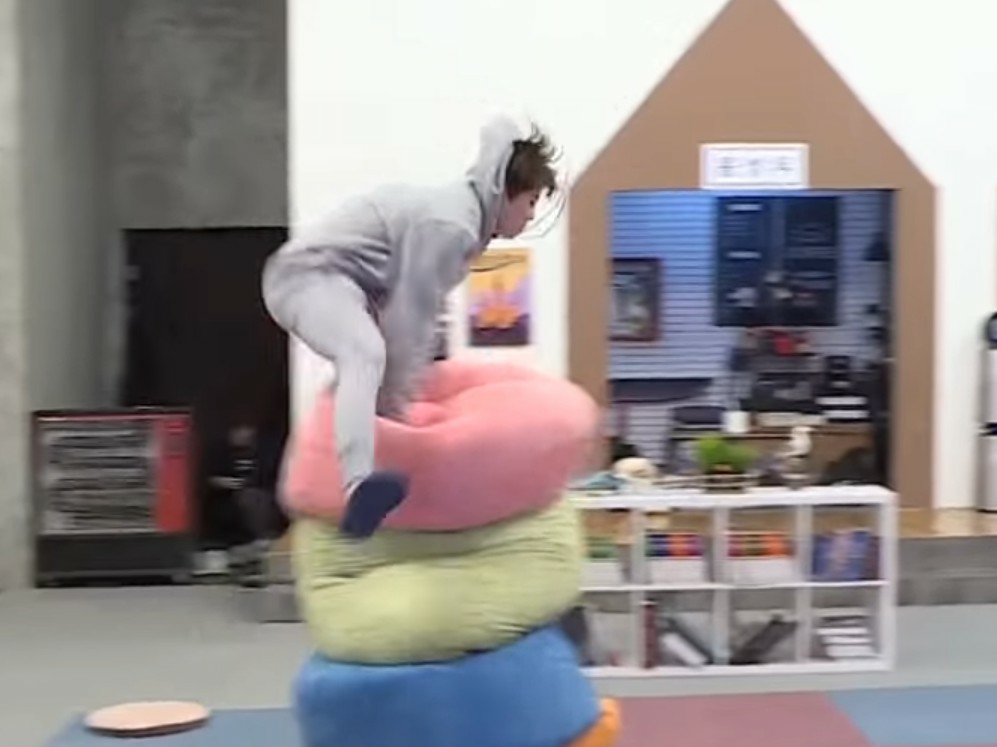 Sungwoon quickly started to gather and stack the large, soft chairs(?) that were around him.