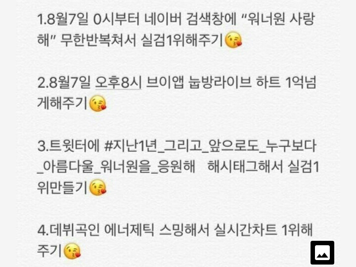 1. Search "Wanna One I Love You" on Naver starting at midnight on August 7th to make it #1 on the real-time search rankings (Search and leave, search and leave)