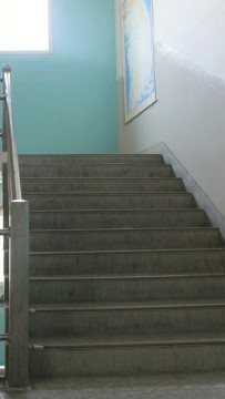 El autor termina de subir las escaleras y se inclina hacia atrás.