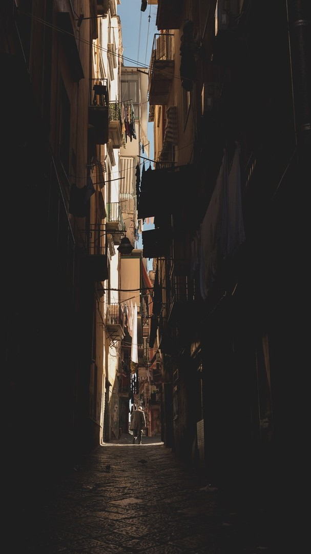 En otro callejón, tres hombres adultos están arrodillados, cubiertos de heridas.