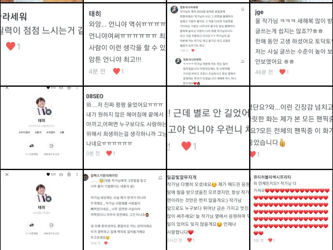 A Mungsil, que siempre me trató con sinceridad, ya sean los avisos que publicaba cuando estaba feliz o cuando pasaba algo, al manager que siempre me daba reacciones lindas incluso cuando lo veía tarde, a Seokjin oppa que vive en Worldwide Handsome, que siempre dejaba comentarios divertidos e hacía que fuera divertido leerlos.