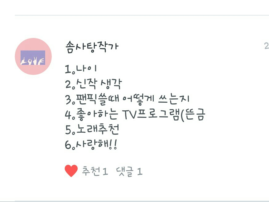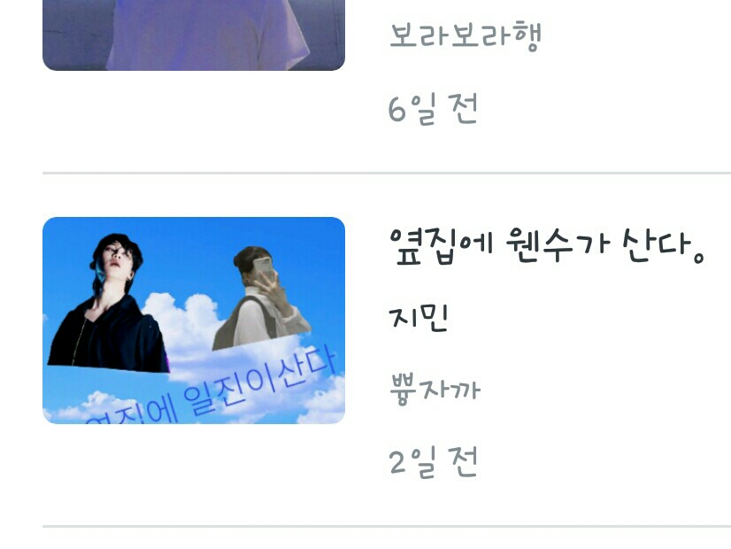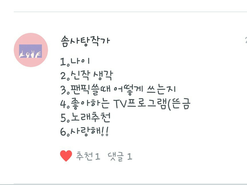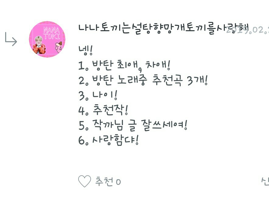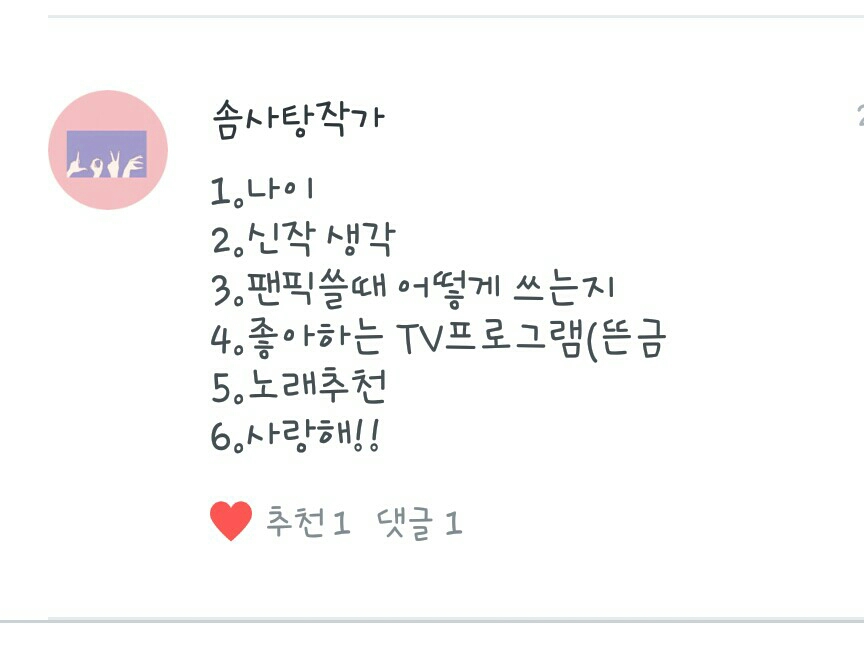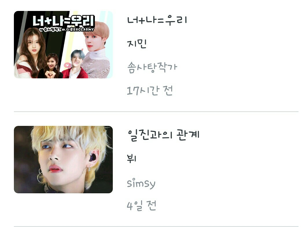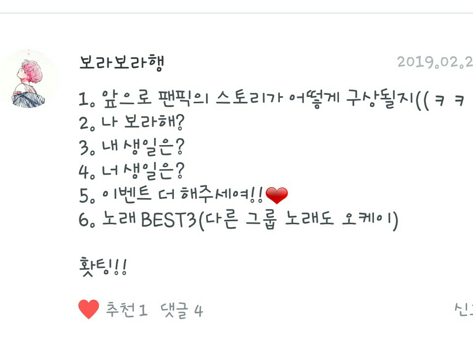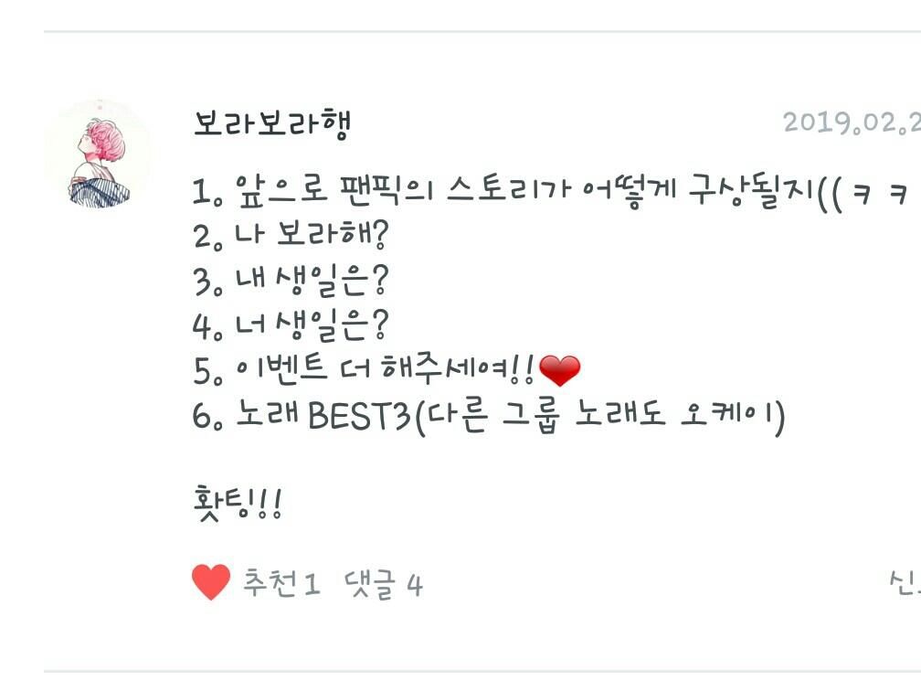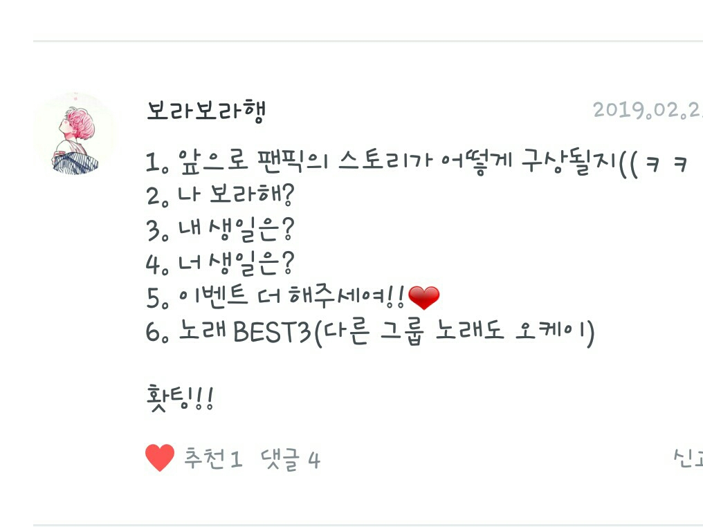 1. Fanfic del día: No puedo elegir ㅜㅜ Pero la razón por la que escribí el fanfic fue porque vi un poco "Relación con los acosadores", así que me quedo con eso.