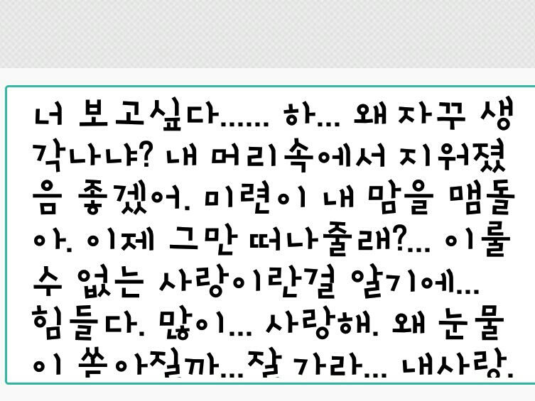 Te extraño... Ja... ¿Por qué sigues viniendo a mi mente? Ojalá desaparecieras de mi mente. Un anhelo tonto me atormenta el corazón. ¿Te irás ahora? Es difícil porque sé que este amor no puede ser... Te amo tanto. ¿Por qué fluyen las lágrimas...? Adiós... mi amor.