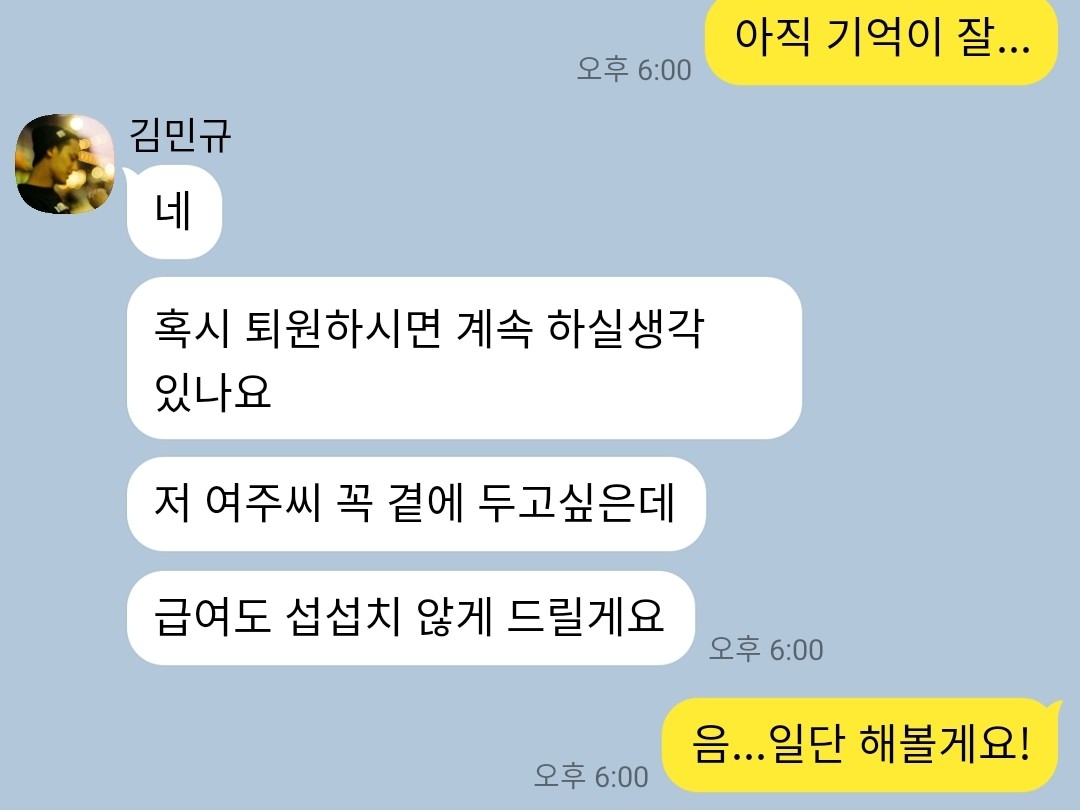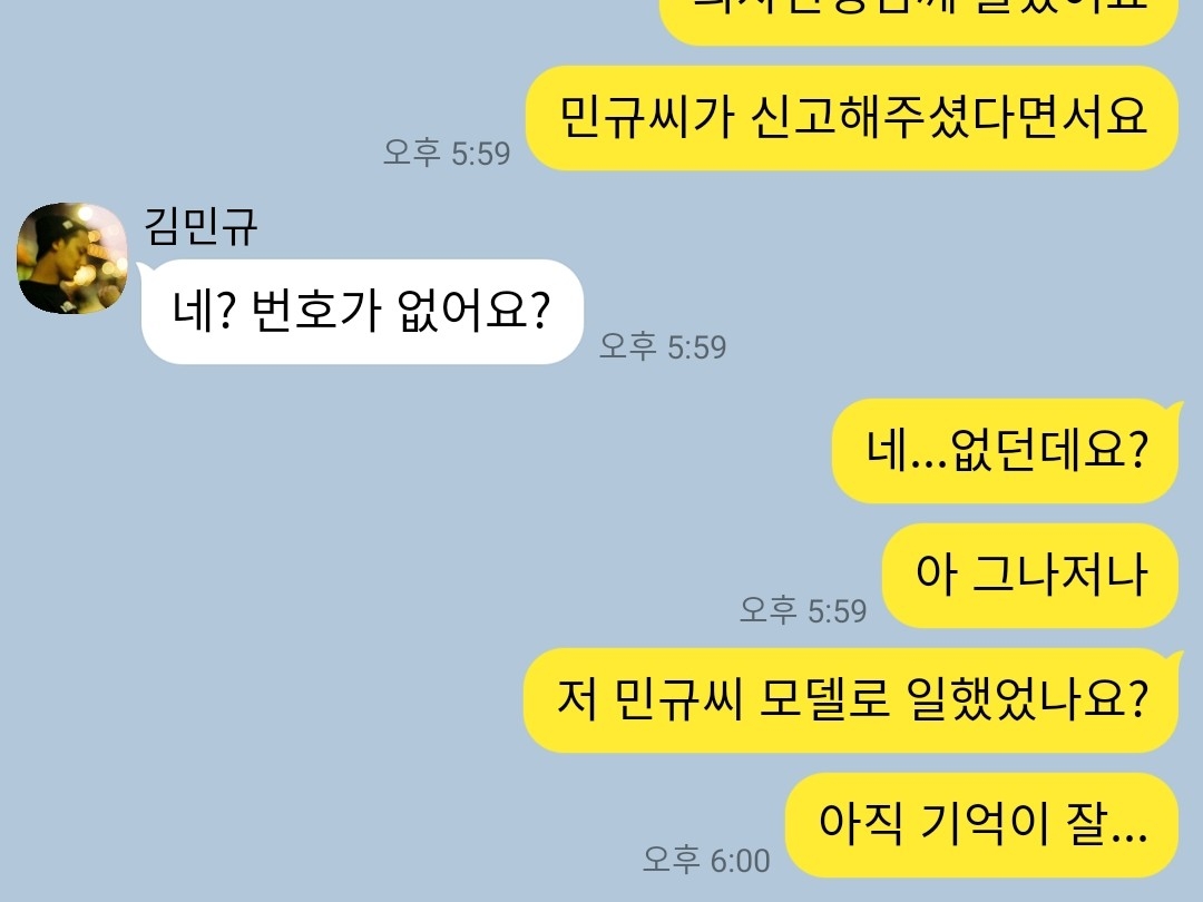 Busqué en mi libreta de direcciones, pero no encontré a Kim Min-gyu. ¿Qué demonios? Si es fotógrafo y modelo, ¿no es Min-gyu el dueño? ¿Ni siquiera tiene número de teléfono? Pero le dije que definitivamente estaba guardado... Entonces recibí un mensaje de Min-gyu en KakaoTalk.