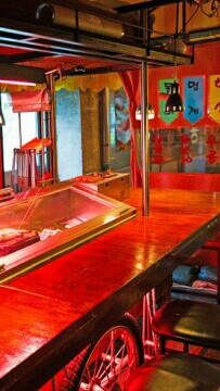 Cuando entramos al puesto de comida, los jueces Kim Seok-jin y Min Yoon-gi estaban sentados allí.