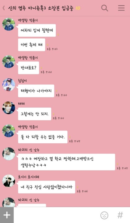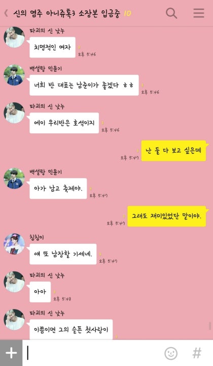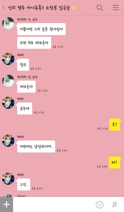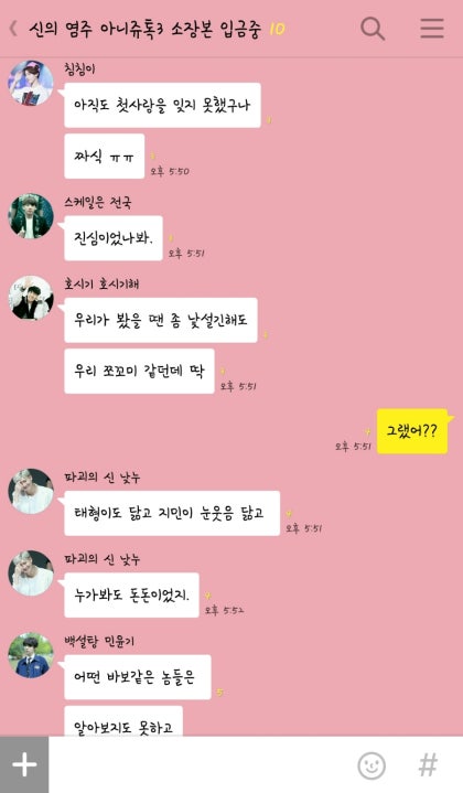 정국의 말에 아쉬운 얼굴로 자리를 옮기는 남자의 모습을 보던 정국과 지민이 바닥을 치며 웃기 시작했다. 나도 웃음 참지 못하고 소리내어 웃기 시작하자 태형이 오빠는 절망적인 얼굴로 한숨을 내어쉬다 내 미소를 보고는 살짝 옅은 미소를 짓는다.