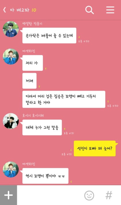 "음, 일단 사람들 많이 나올 때 달려가서 석진오빠 옆에 딱 붙어 앉아. 그러면 일행인 줄 알고 안 물어 볼 거야. 대학교 신입생 환영회에 동안인 애가 있구나 하겠지."
