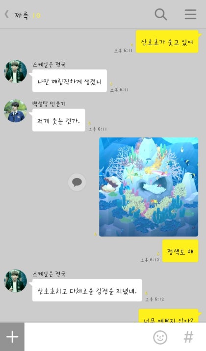 정국오빠의 이야기때문에 괜히 산호초 표정이 깨림직해 보인다. 하여간 정국오빠는 그렇게 이야기 만드는 것도 재주라니까. 나는 정국오빠의 훼방에도 꿋꿋하게 물고기 게임을 이어갔다.