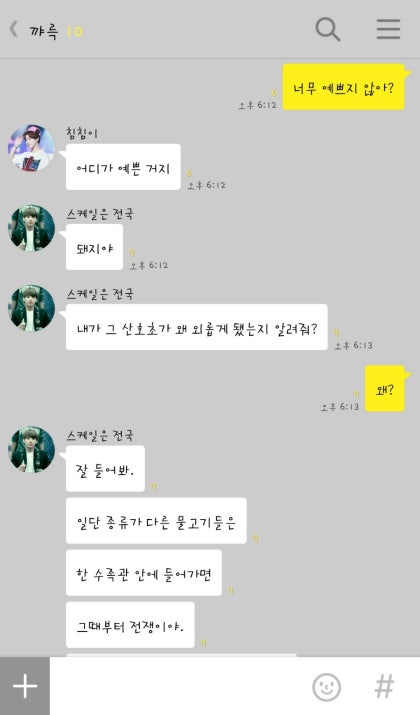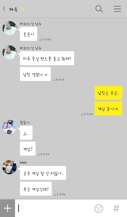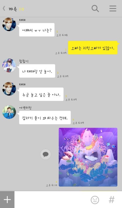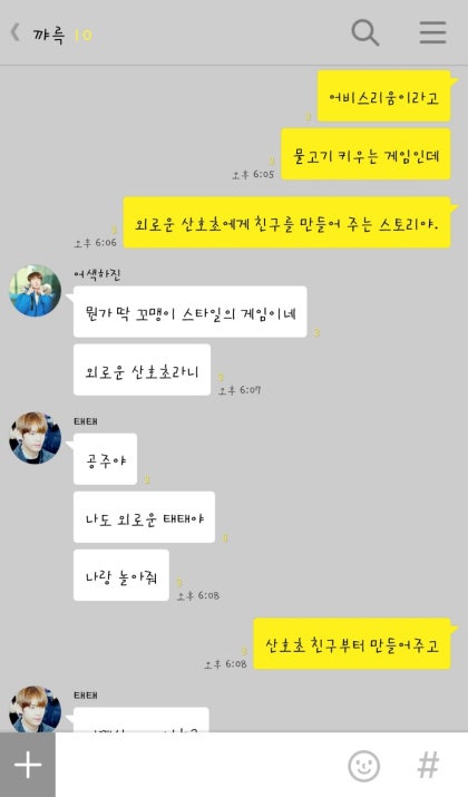 맨날 혼자 놀아. 공주가 안 놀아주면 외로운 왕자님이야. 내 어깨에 기대서 계속해서 칭얼거리는 태형오빠 덕분에 나는 어쩔 수 없이 물고기 게임을 끄고 태형오빠와 놀아주기로 했다.