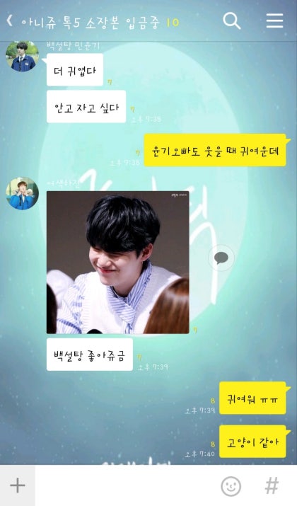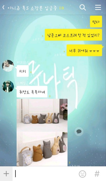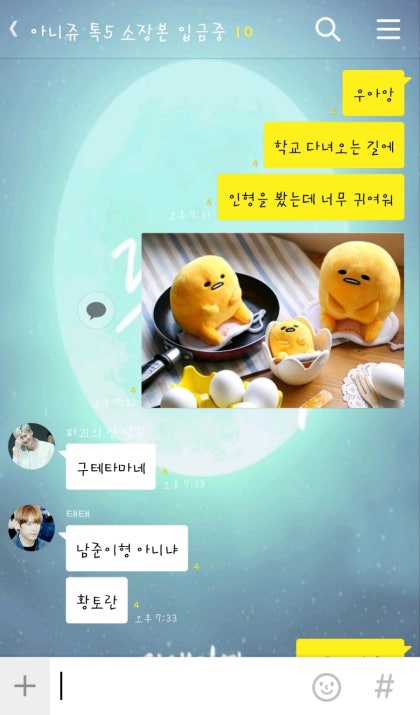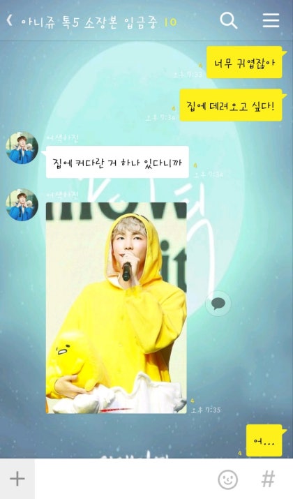 원래 귀여운 걸 좋아하기는 했지만 요즘 들어서 귀여운 인형이나 물건이 더 좋아졌다. 침대 위에 선물 받은 인형을 올려두고 거실로 나오자 윤기오빠와 남준오빠가 소파 위에 앉아있다.