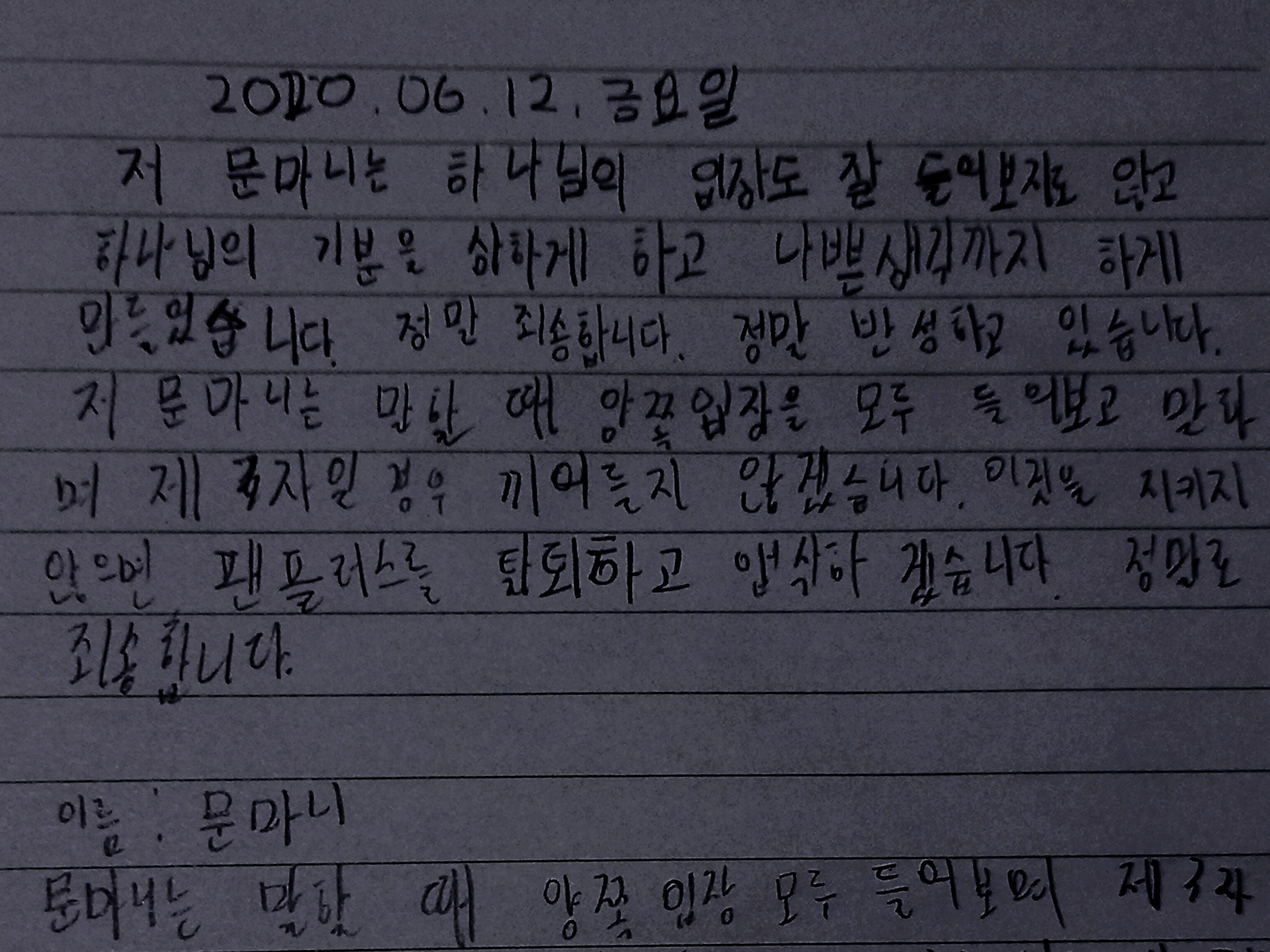 저 문마니는 망개망개씌님의 방을 들어가 하나님 외 다른 분들께 피해를 들이고 불쾌하게 했습니다 정말 죄송합니다 정말 많이 반성하고있습니다 죄송합니다 다시는 이런 일이 없도록 하겠습니다 죄송합니다 이 일로 피해보신 분들께 정말 죄송합니다 제 말할 때에는