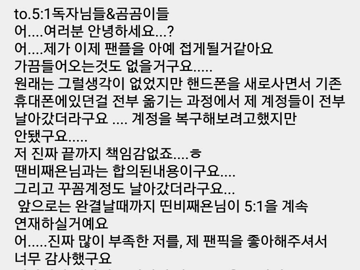 꾸꼼이가 더이상 팬픽을 쓰지도 들어오지도 못할거 갔다고해서