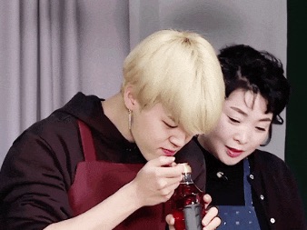 여주씨는 절여진 배추를 조금 뜯어 정국이 입에 넣어주었어요