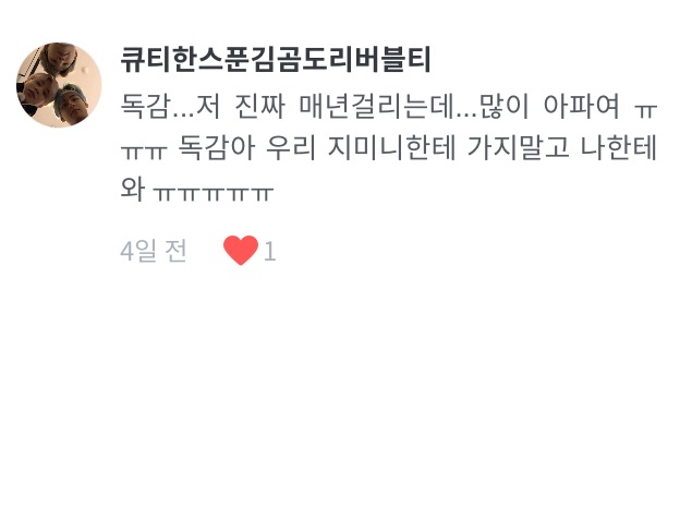 누나도 이번에는 독감 안걸리게 태형이가 기도해주께여!!