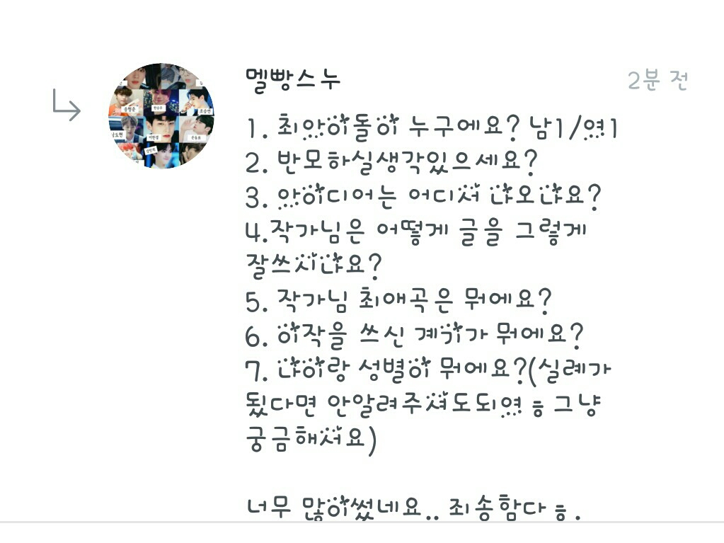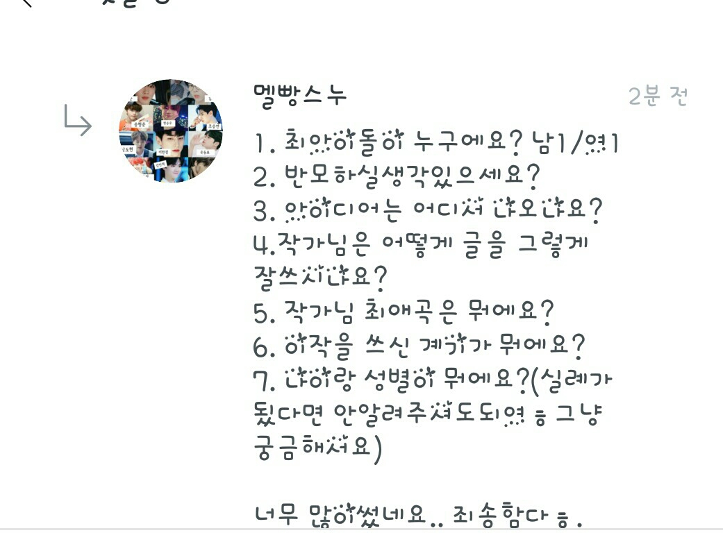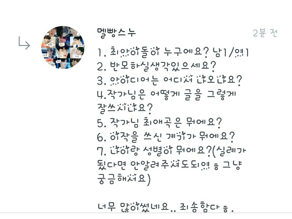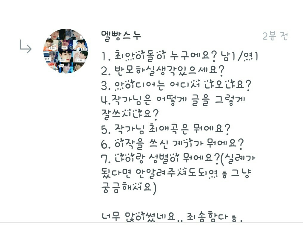 4.저 글 못쓰는뎋 칭찬 감사해요♡ 5.최애곡은 당연히 최애돌들의 곡이예요! 6.어.. 이작은 제가 많은 팬픽을 보는데 저도 해보고 싶어서? 썼어용!