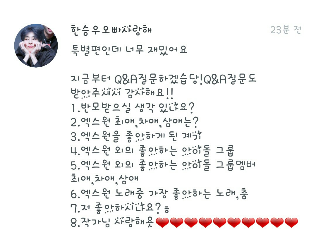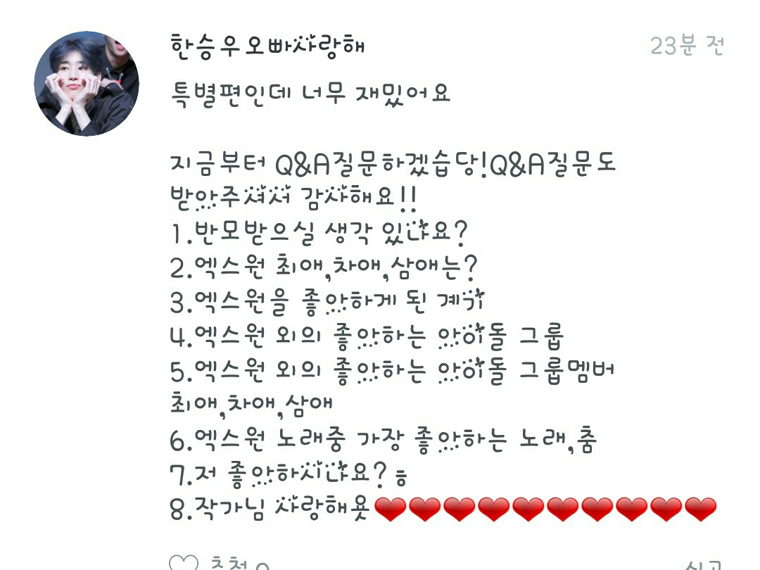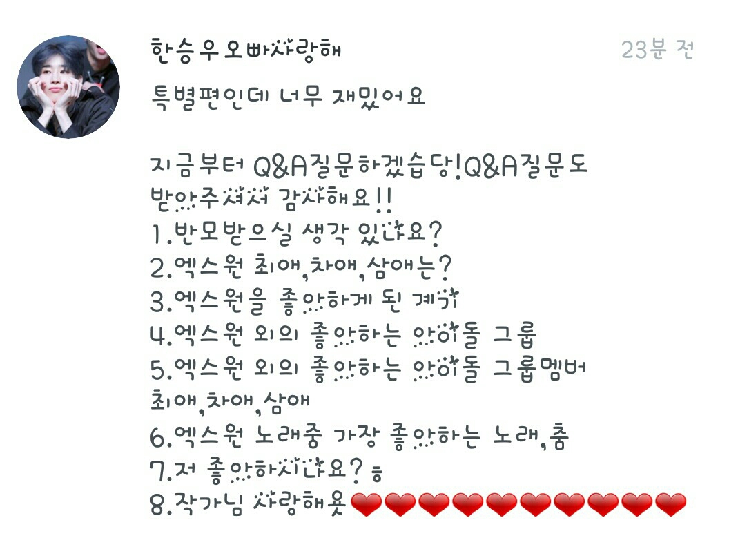 1.반모는 생각있으면 할께용!! 2.엑스원 최애는 요한,차애는 동표,삼애는 우석이예용!! 3.음.. 그냥 좋아서요??ㅋ