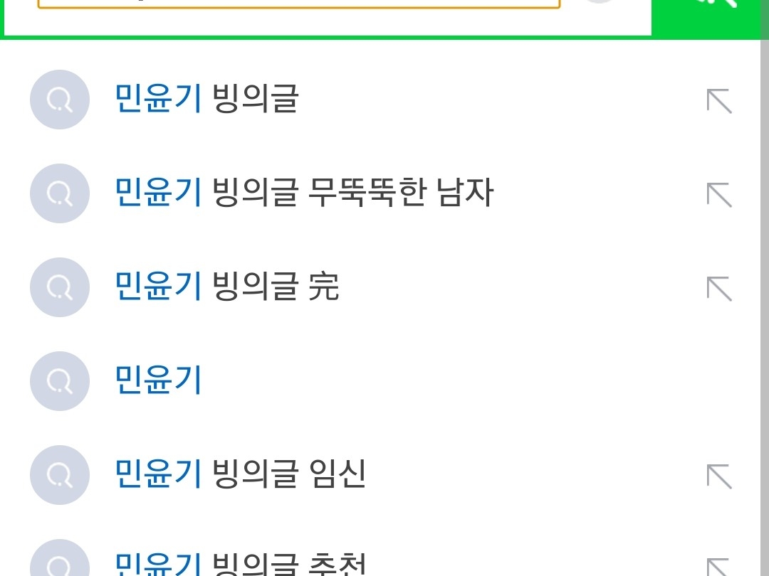 검색 클릭을 안하고 치기만 하면 저렇개 나와요 민윤기 만이 아니라 방탄소년단 단체도 각자이름도 전부다 저렇게 나와요 말이안되죠?
