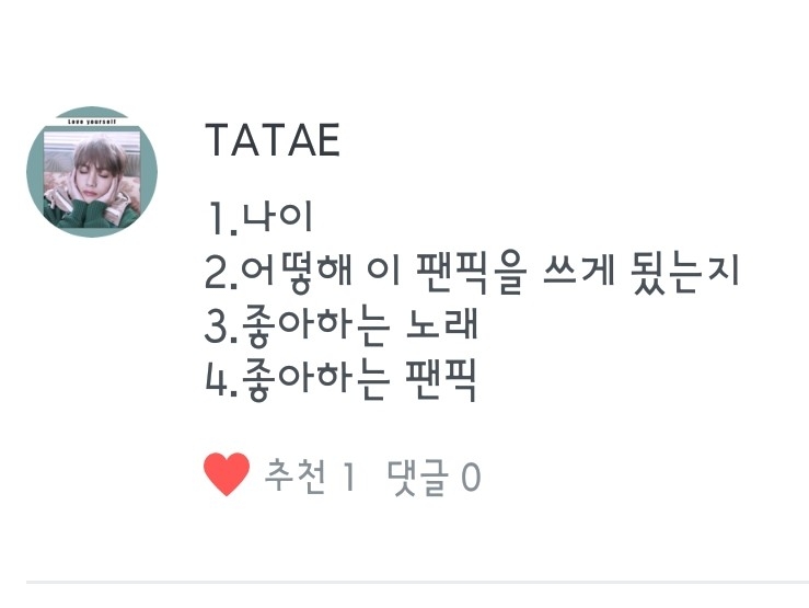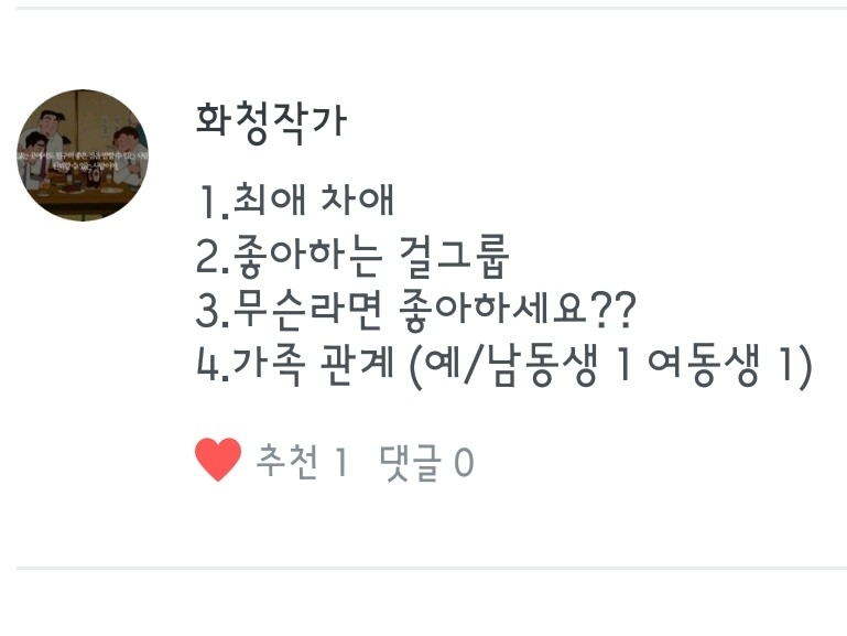 최애는 정국오빠! 차애는 윤기오빠 랍니다! / 좋아하는 걸그룹이 없어요오ㅠㅠ / 저 육개장 좋아합니ㄷ... ㅎㅎ / 저는 외동이랍니다... 따흑