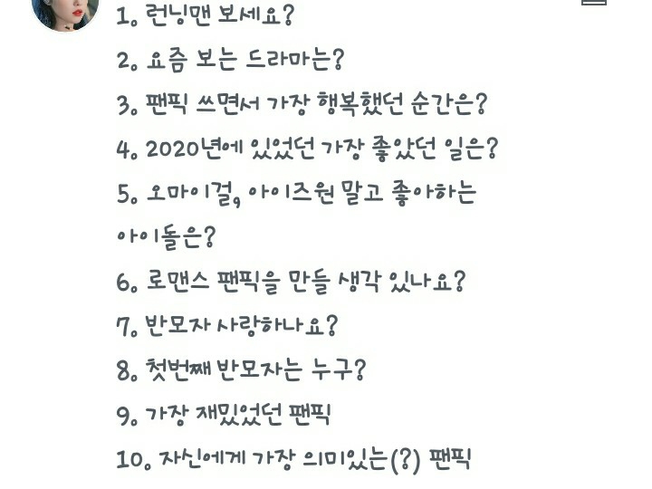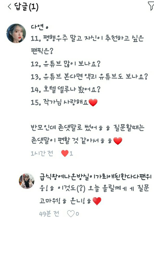 내 작중에? 아님 다른작?ㅎ 다른작중에 가장 재미있는건..일진생, 그리구 반모자들 작! 지난번 Q&A에 나왔오!!~ㅎ♥️