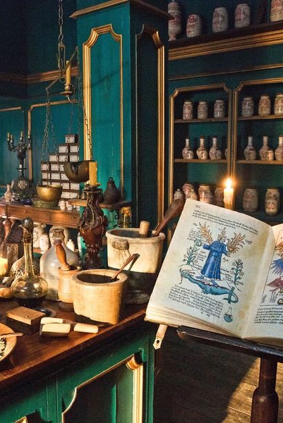 탁자 위에 약초를 미뤄두고 칼을 올려두는 루베트