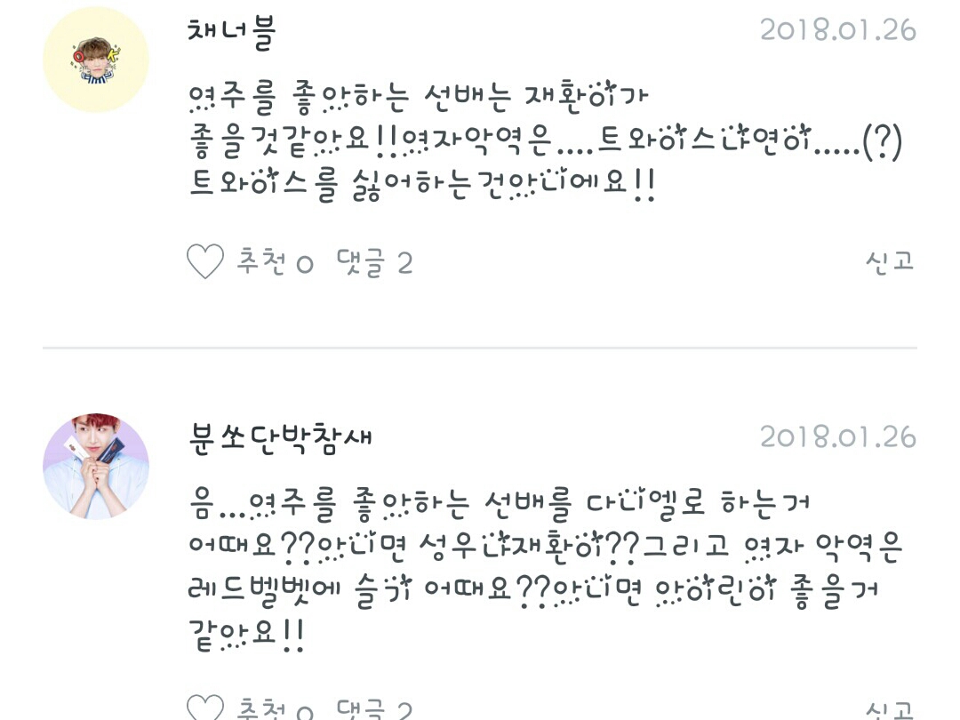 두구두구두구두구 여주를 좋아하는 선배 후보로는 다니엘,성운,성우,재환 이 나왔습니다. 이중에서 가장 많은 표을 받은 사람이 여줄 좋아하는 선배가 될거예요. 그의 이름은 바로