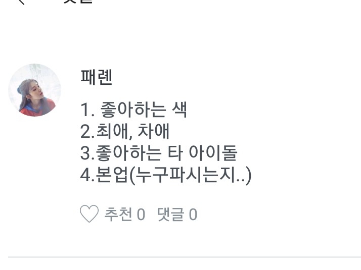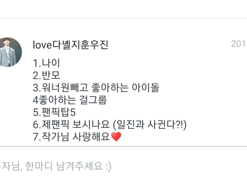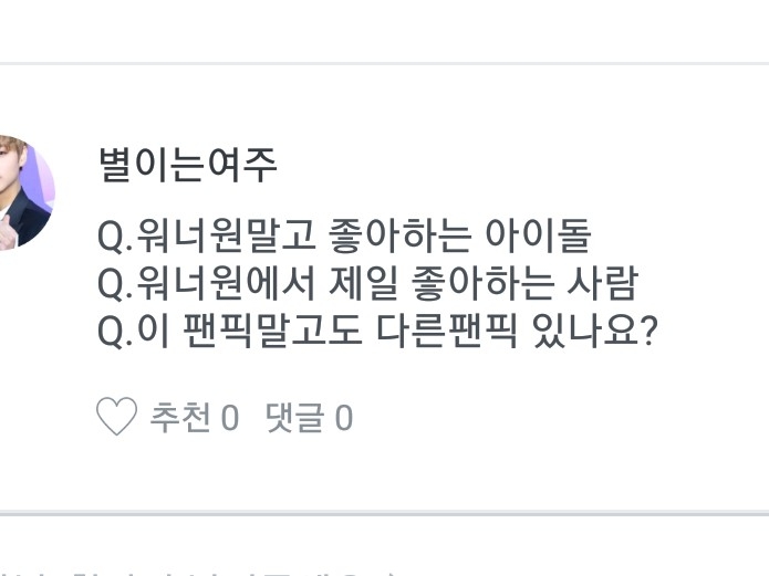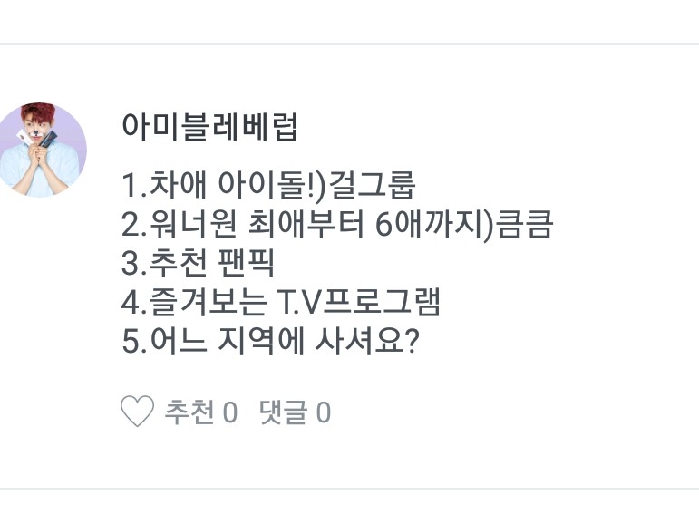 1.차애 아이돌은 여자친구 에영 2.워너원 최에는 지훈이 차애는 다녤 대휘고 삼애는 다른 맴버들이 공동삼위에용 3.추천팬픽은 위에 써놨어영 4.즐겨보는 TV프로 그램은 음방 위주로만 봐요 5.저는 세종시 쪽에 살아영
