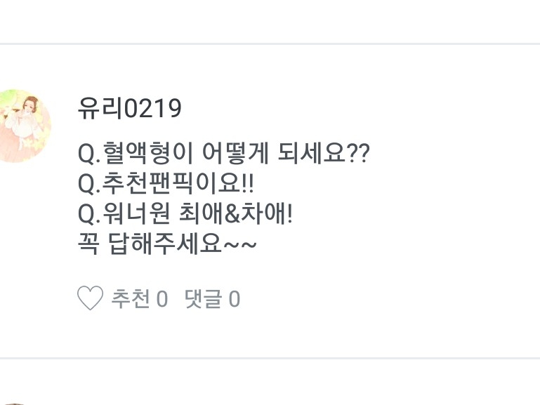 1.혈액헝은A형 이에요 2.추천 팬픽은 싸가지와 3개월, 일진과 철벽녀(이거 말고 다른거요),나만 모르는 사랑, 축구부 그애, 눈치 싸움이에요 3.최에는 지훈이구요 차애는 다녤하구 대휘에영