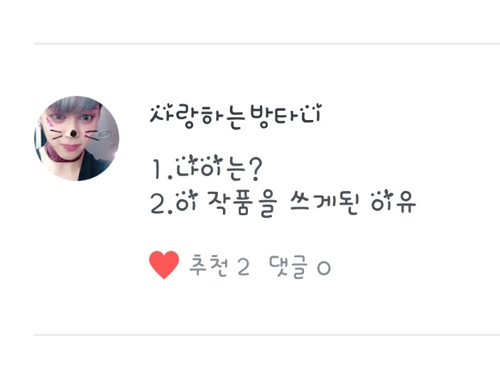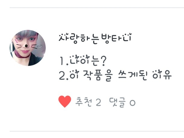 사랑하는 방타니님의 또다른 질문! 이 작품을 쓰게 된 이유는 제가 다른 작가님들의 작품을 53개 보는데 어느 날 다른 작가님들의 작품을 보다가 '나도 한 번 써볼까?'라는 생각으로 쓰게 된 것입니다.