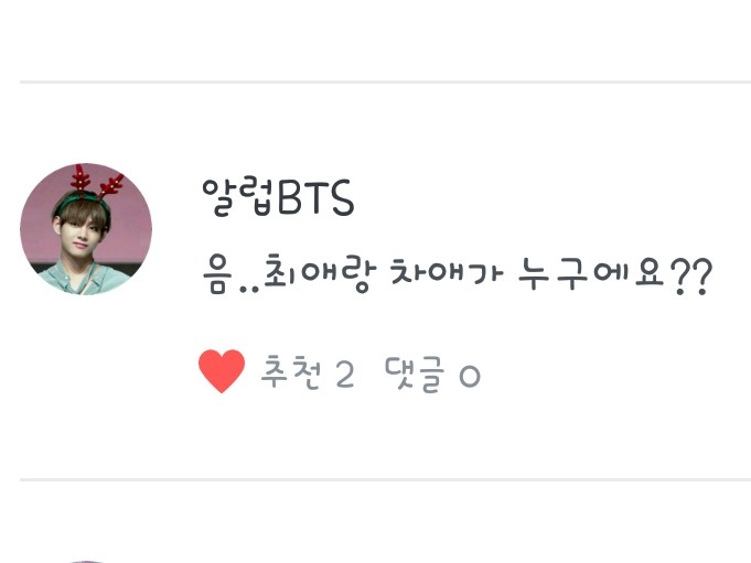 알럽BTS님의 질문! 제 최애는 지민이고요. 차애는 뷔와 정국입니다.