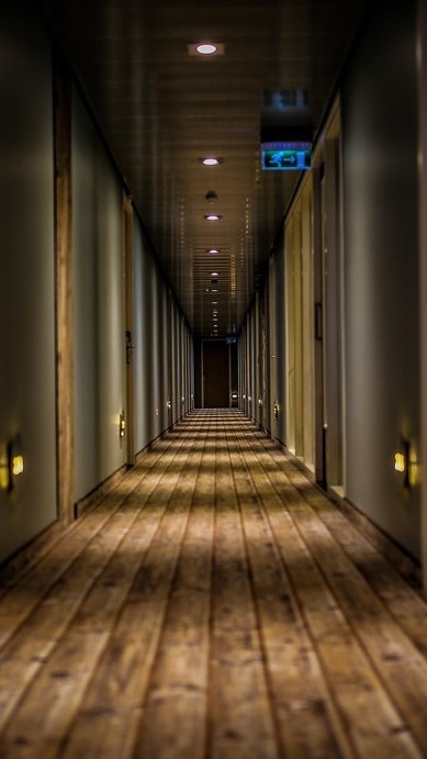 (복도를 계속 두리번거리며 서성거린다)