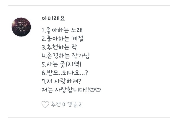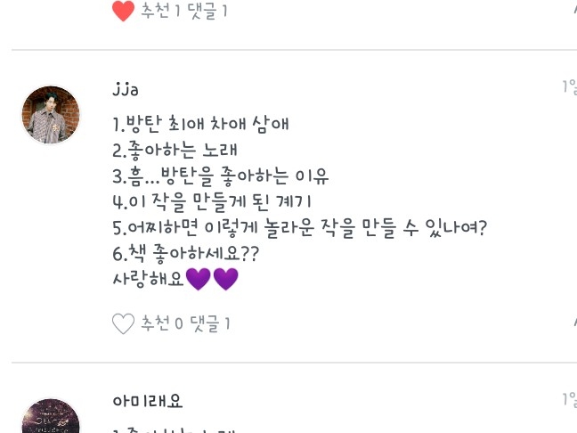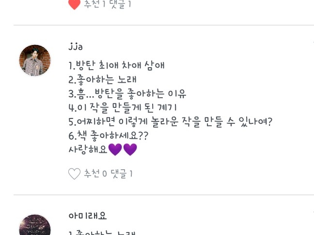 1. (제가 아미는 아니지만..그래도 뽑는다면) 1. 쥐민씌 2. 윤기씌 3. 태형씌요 2.세븐틴 HIT 3. 음...(예전기억 되살려서) 완벽해서★ 4. 제 친구시키들이 하니까 따라 만들었어요 전에 했었는데 지웠고 이게 새로한 작품입니다