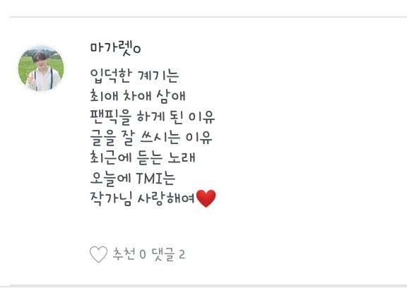5. 어머머 놀라운 작이라고 해주셔서 감사합니다 제 생각 코믹이라서(?) 그런것 갔습니다 6. 책이라면 정색합니다(싱긋 7. 저도요♥