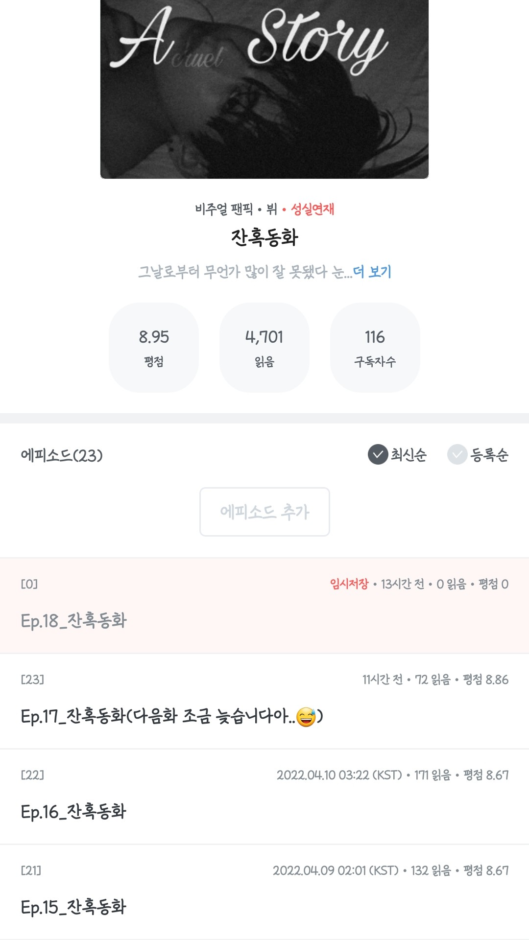 스토리 에피소드 별점이 2개 화 정도릉 제외하고는 8점