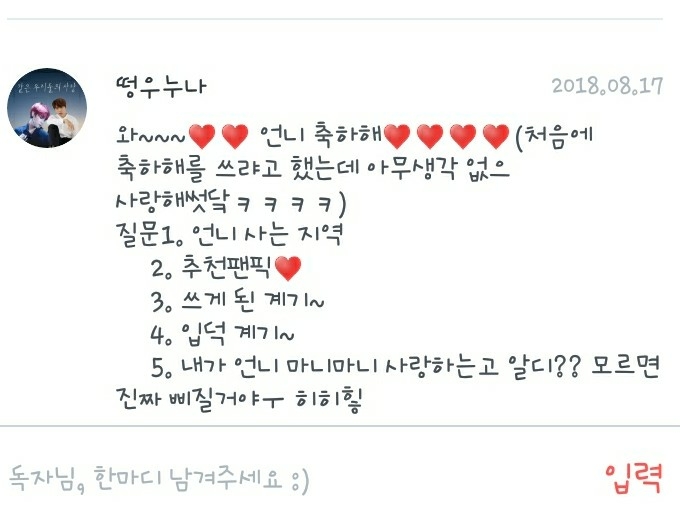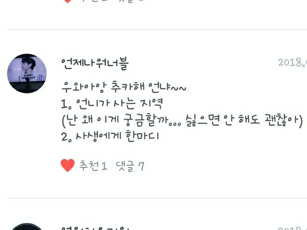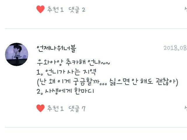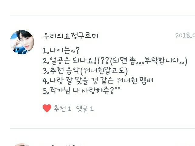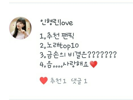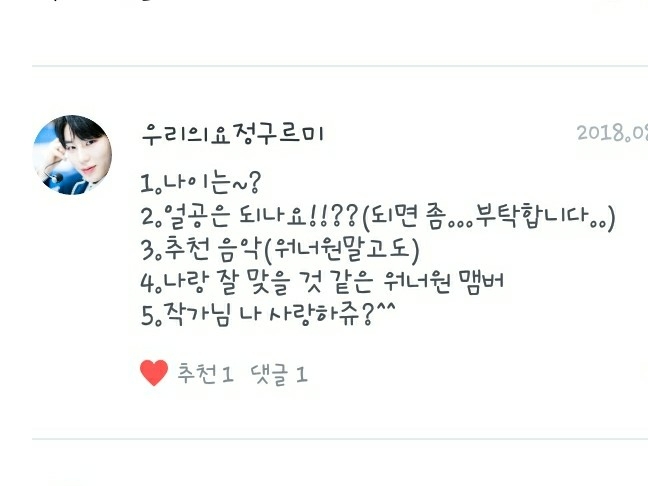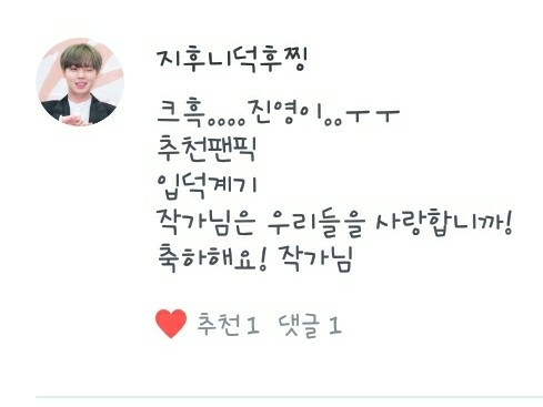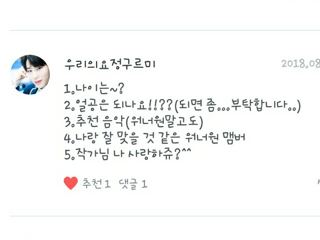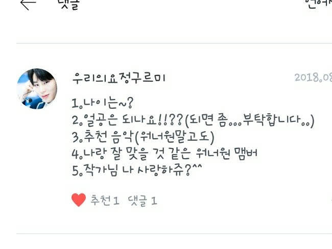 2. 제가 보는 팬픽은 주로 제 독자님들것인데, 떵우누나의 <같은 우리 둘의 사랑>, 언제나워너블의 <LIEF:연이>, 녤뭉ㅇ평생아미님의 <집착남>, 아흔블의 <11명의 남사친> 등 입니다!