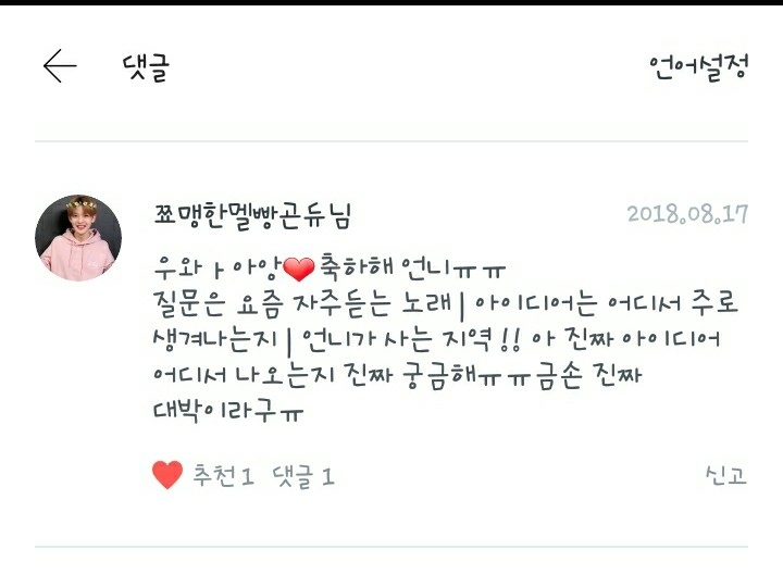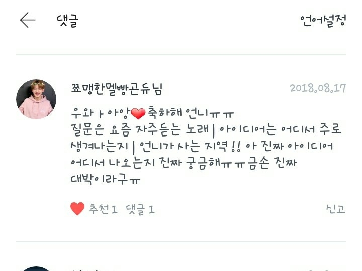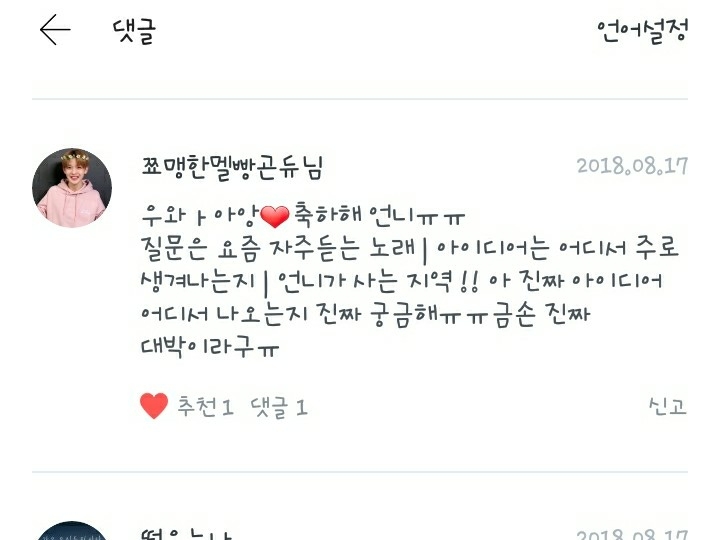 1. 요즘 자주 듣는 노래는 워너원 노래는 항상 듣고 그 외에는 숀의 way back home, 아이콘의 죽겠다 입니다! 강추!
