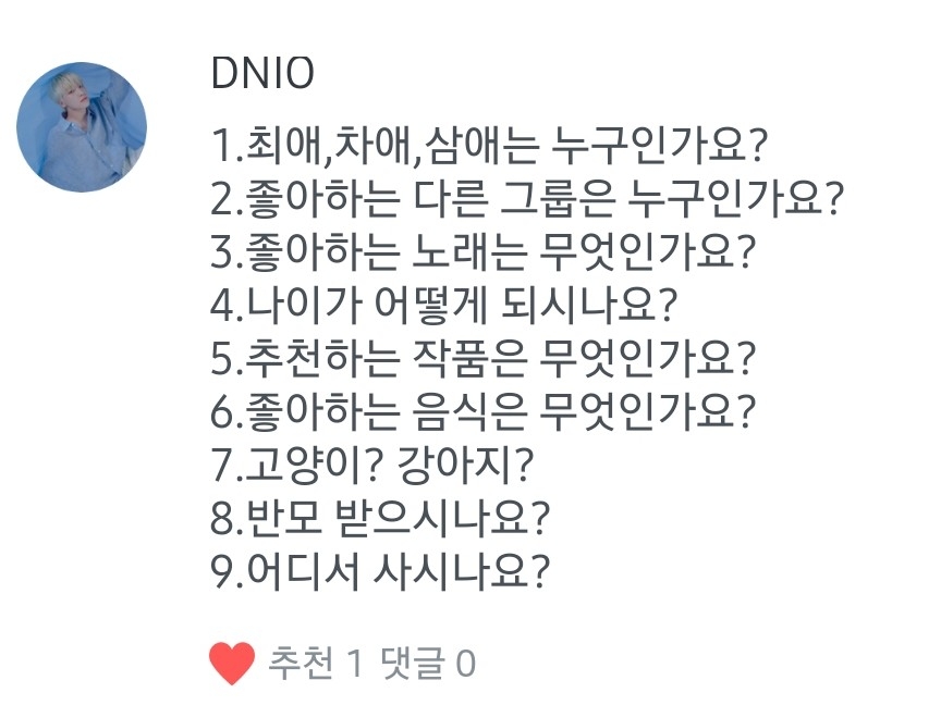 1.최애는 슈아님! 차애는 승관님! 삼애는 전부욥! 2.위너,엑스원 좋아해요! 근데 아이돌 다 좋아해요!!!♡ 3.빅톤-오월애,세븐틴(보컬팀)-나에게로 와,위너-공허해요!!