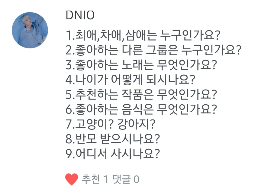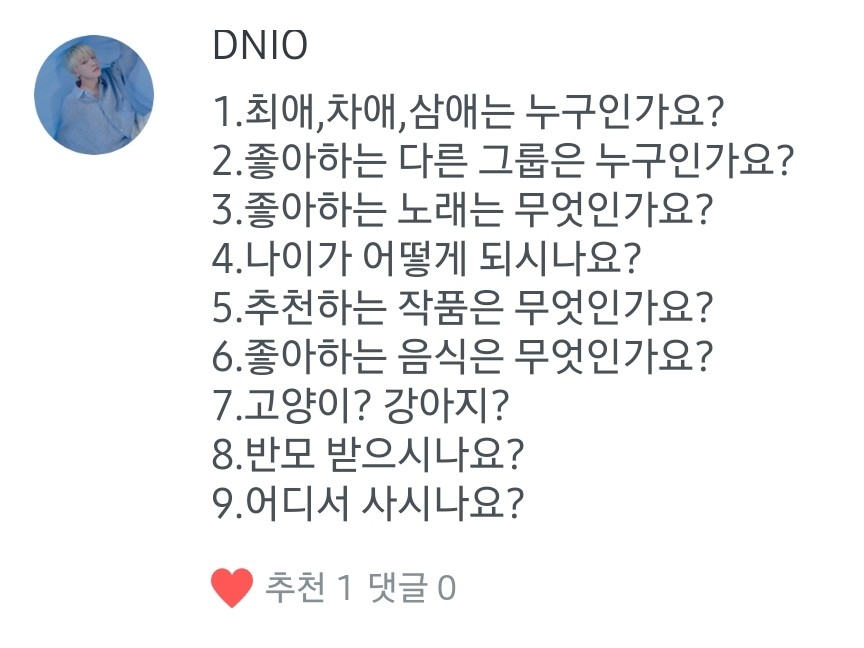 6.전 닭발을 좋아해여 ㅎㅎ헤 7.고양이를 키우고 있어서 고양이요! 8.반모 당근 받습니다! 9.승관님의 고향인 제주도요! ㅎㅎ