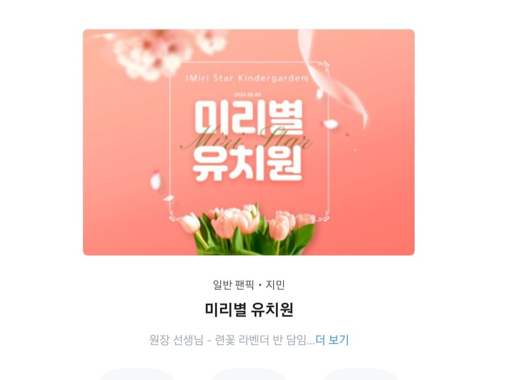그 다음은 미리별 유치원입니다! 현재 22명의 원생들이 들어와있으며 캐스팅 방식은 울력휘학과 비슷합니다! 저는 라벤더반에서 활동하고 있으며 자세한 정보는 '미리별 유치원'을 검색하면 나오니 많은 관심 부탁드립니다 🥰