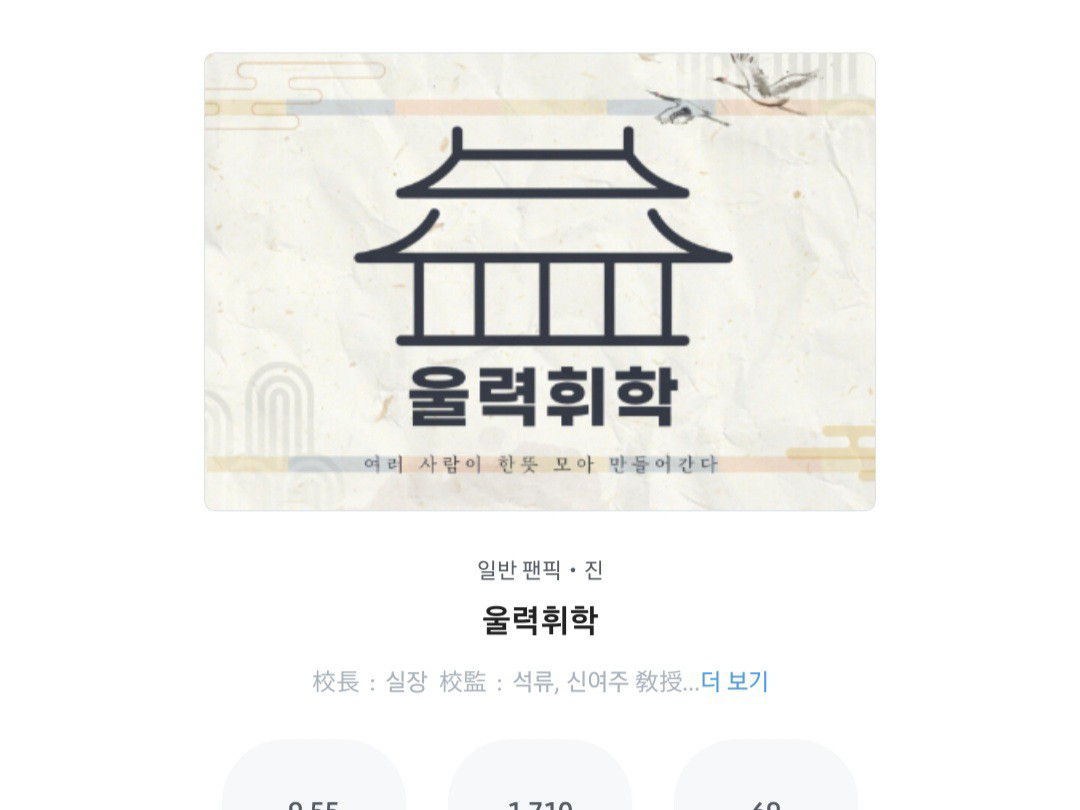 먼저 울력휘학! 현재 49명의 생도분들이 들어와있으며 필력 좋은 작가님들이 저처럼 입학 제안을 받고 있습니다! 저는 백호관에서 활동하고 있으며 자세한 정보는 '울력휘학'을 검색하면 나오니 많은 관심 부탁드립니다 🥰