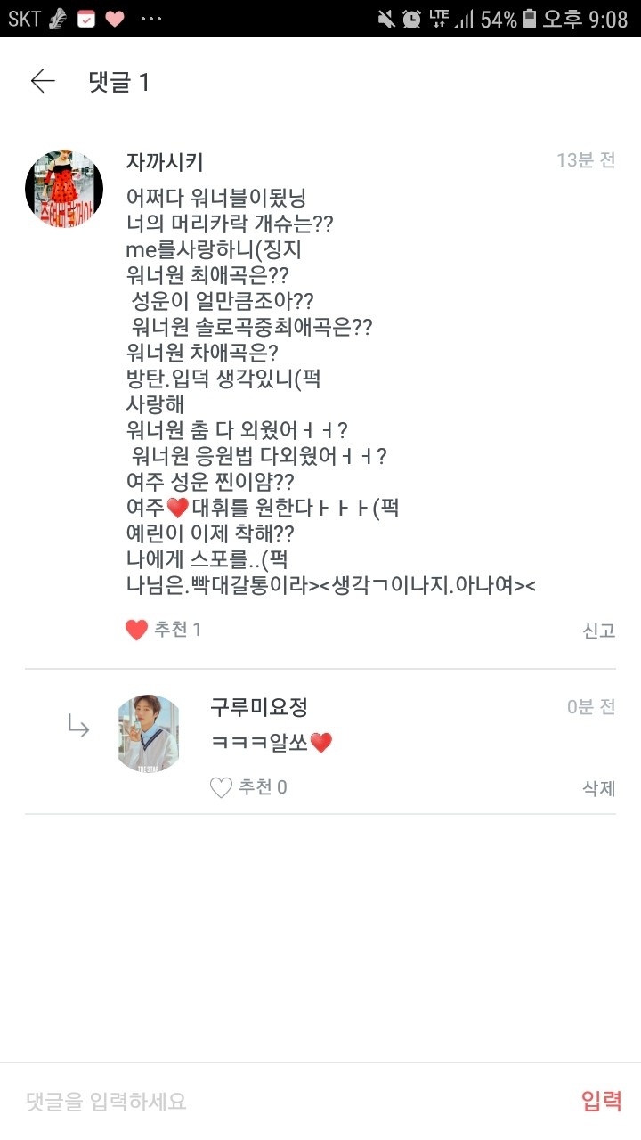 1. 친구가 워너블인데 나도 따라서 워너원보다가 워너블이 됬어><((데헿~☆