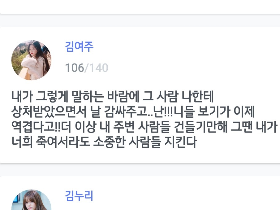 난 그 답을 이제야 찾았어 그때 우린!!너무 약하고 겁이 많은 아이들이었고 당당함 그리고 용기가 없었어 그래서 누가 맞고 욕 들어도!!!가만히 있을 수 밖에 없었어!!!근데 지금은 아니야 우린 지금 그때랑 많이 달라 그러니까 이제 더 이상 나대지마