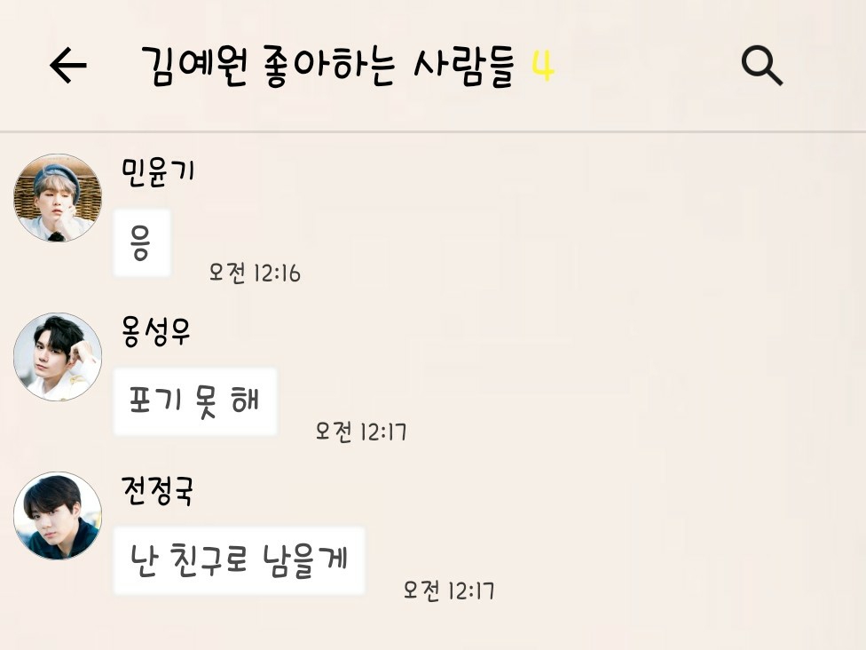 김석진, 민윤기, 박지민, 김태형, 전정국, 옹성우, 박지훈, 육성재