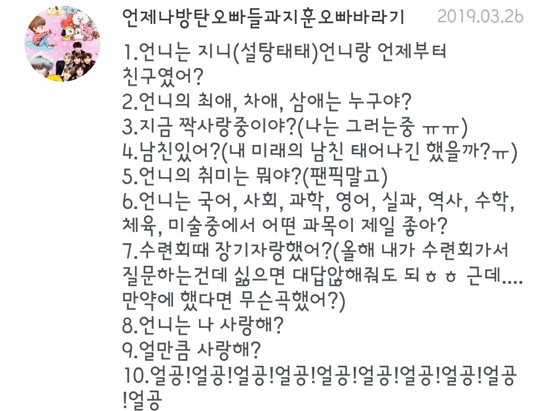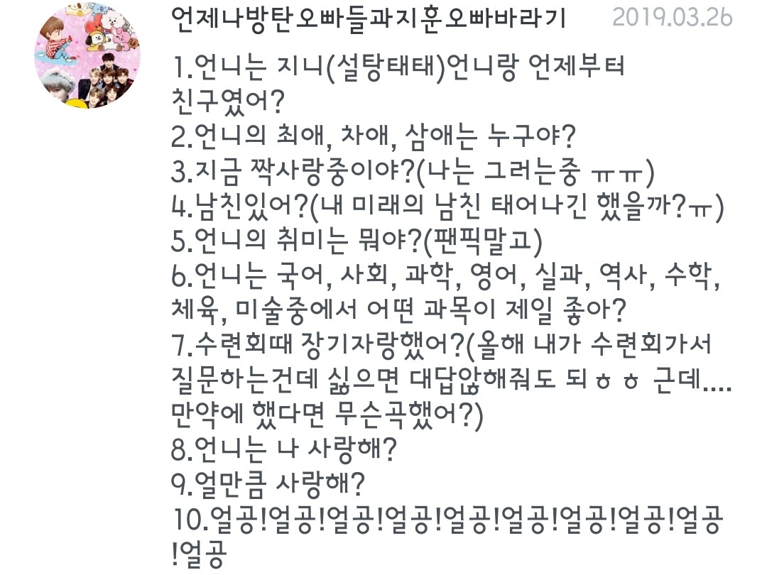 7.수련회?? 수학여행갔어??? 부럽댜.. 우린 학부모반대로 취소ㅠ 8.웅 당연하징♥ 9.하늘만큼 땅만큼!!!!!!💕💕 10.얼공... 따흙ㅠ